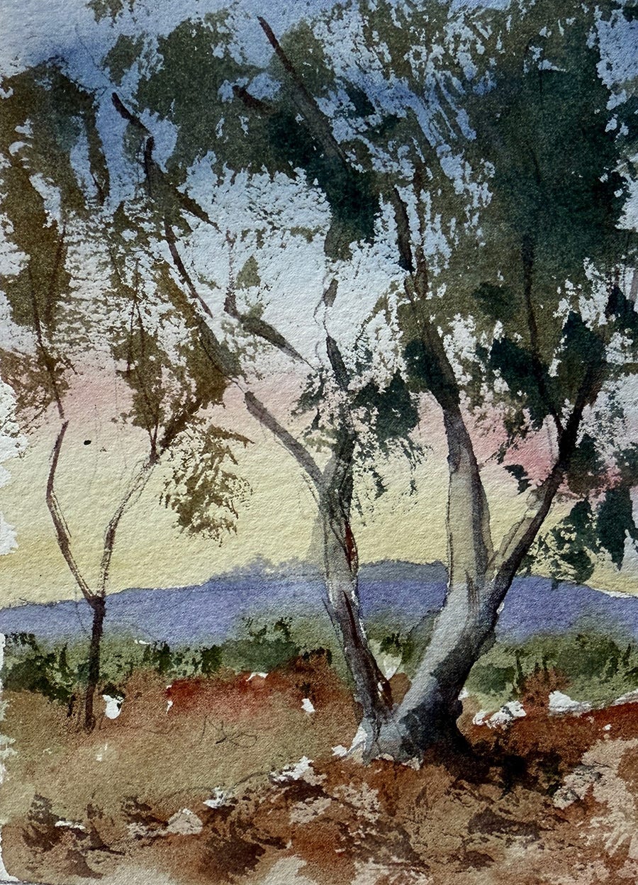Paint a few loose trees (refer to this tree exercise)