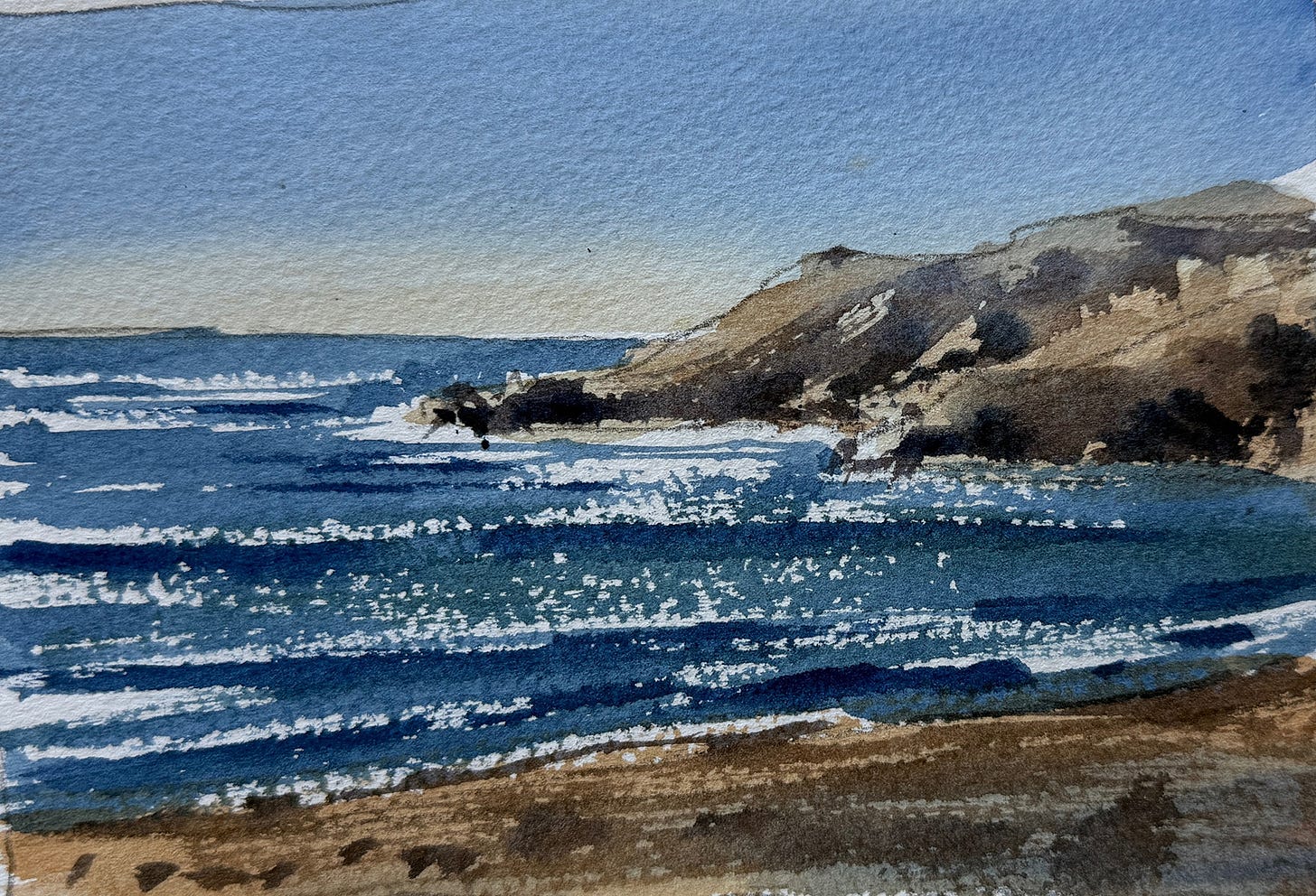 Simple horizon with dry-brushed horizontal strokes for wave texture and sun sparkle.