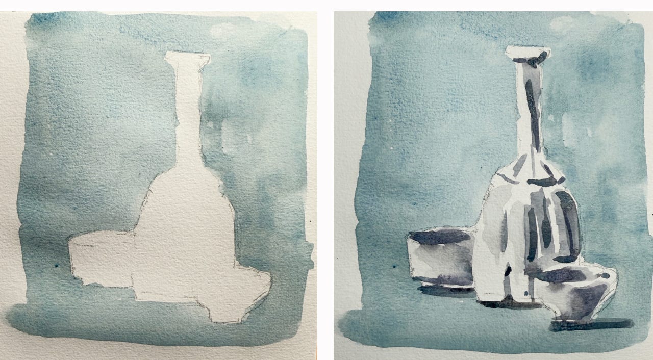 For the second example, I drew inspiration from Giorgio Morandi (more on him below), creating a simple still life defined solely by painting the space around them first.