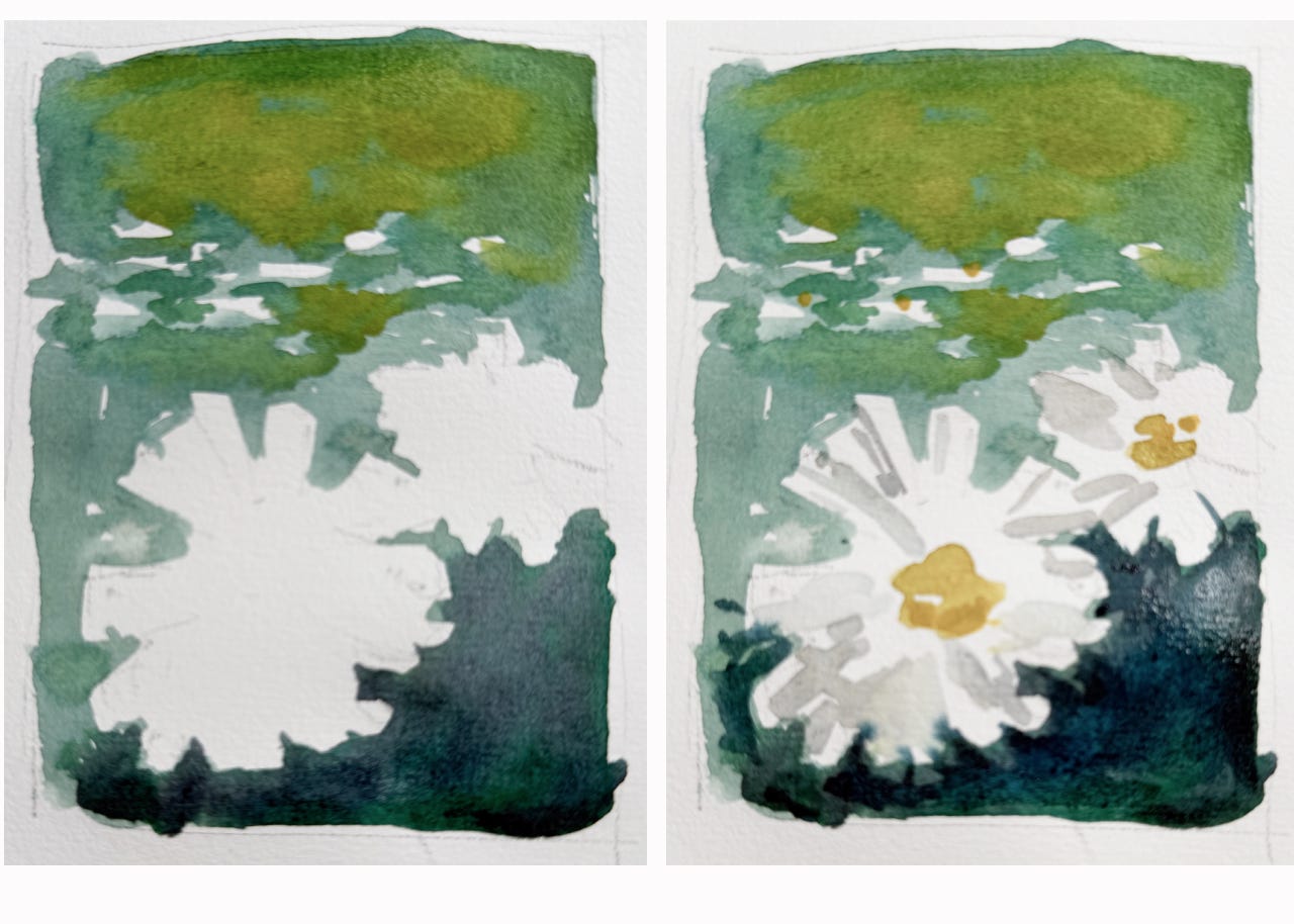 In my first example, I painted two daisies. The flowers emerged purely from painting the background between them.