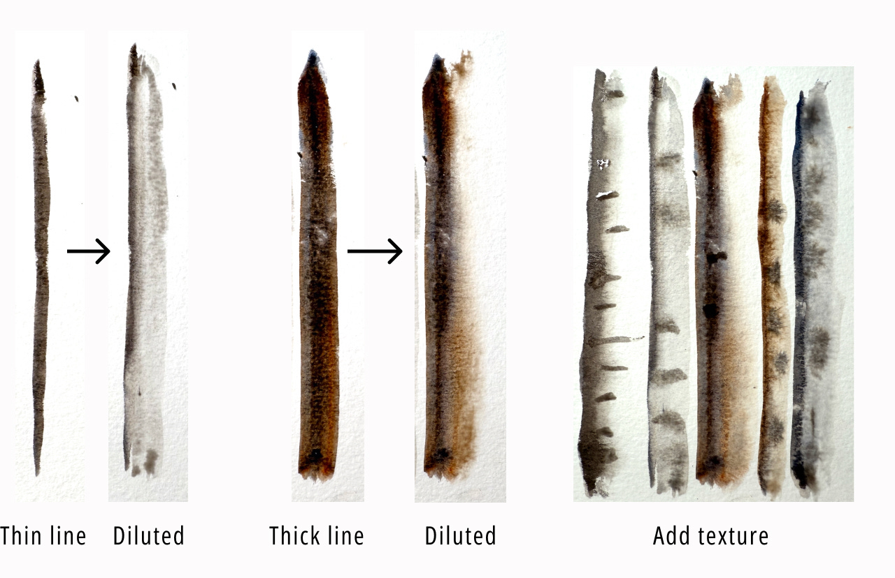 WIth a clean, damp brush (I use a 2nd brush), drag along the painted line and dilute it. Again, make it as thick or thin as you like.