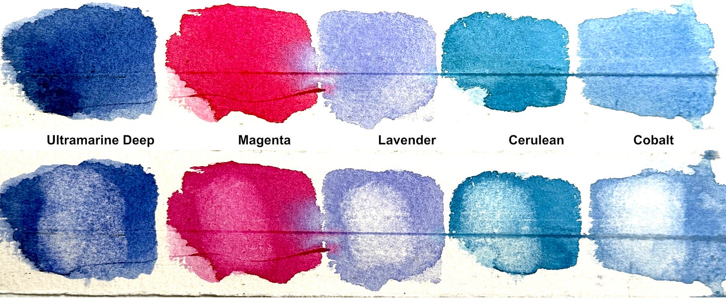 Before we start painting, we need to know which colours will actually lift. Some pigments, like Alizarin Crimson, Phthalo Blue, and Sap Green, stain the paper fibres and are nearly impossible to remove. Others sit more on the surface and lift cleanly.