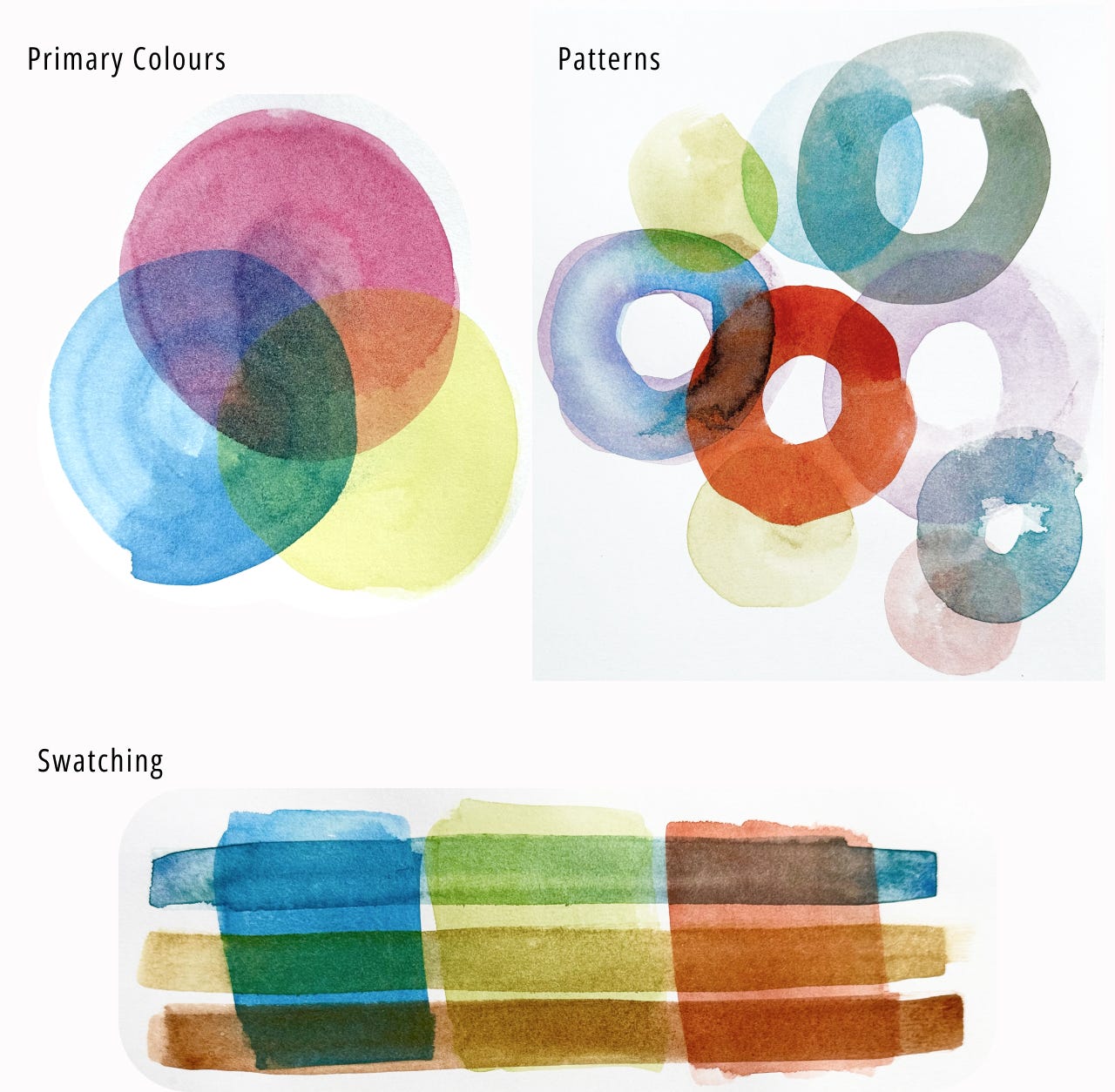 As per the instructions above, I painted my primaries, layered shapes and played with letters. It’s also a great way to swatch colours, and explore how different colours interact. You’ll see instantly which of your pigments are transparent, semi-transparent or opaque.