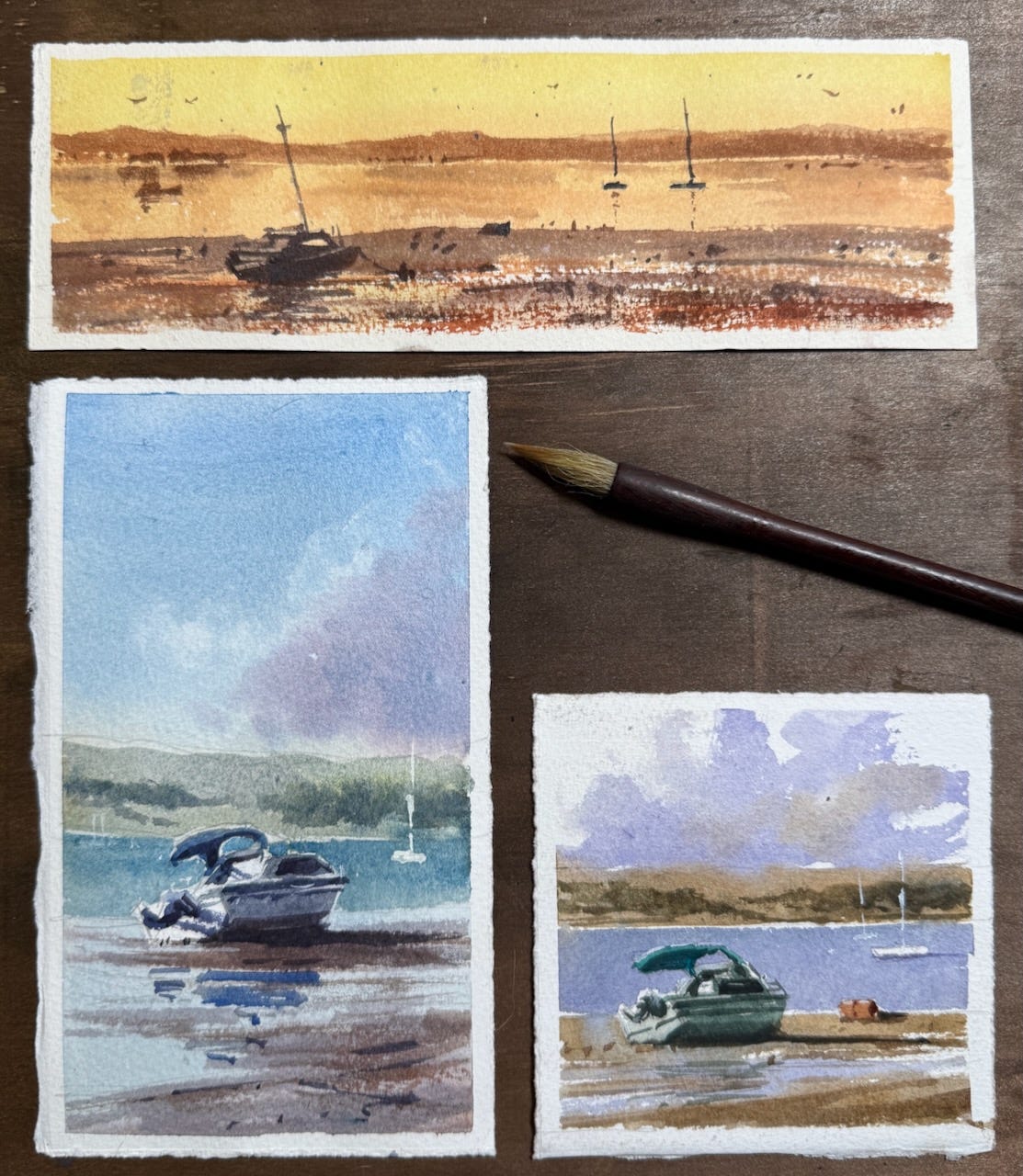 For this exercise I also encourage you to paint the same reference in different formats. And change up the colours and values while you’re at it. A series of quick paintings can help you design your final image before you commit to a larger size.
